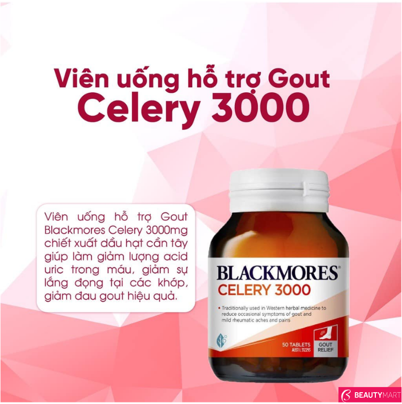 Blackmores Celery 3000 - Viên Uống Điều Trị Gout của Úc, Hộp 50 Viên chính hãng đã có mặt ở thị trường Việt Nam. Hàng chính hãng, giá tốt được phân phối tại thương hiệu UY TÍN gần 20 năm kinh nghiệm và phân phối chính hãng chuyên Dược Mỹ phẩm Pháp BeautyMart. Dịch vụ ship COD toàn quốc, kiểm hàng trước khi nhận và bảo hành sau bán hàng nên khách hàng hoàn toàn yên tâm khi mua hàng chính hãng tại BeautyMart.