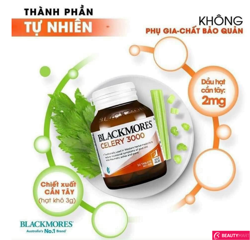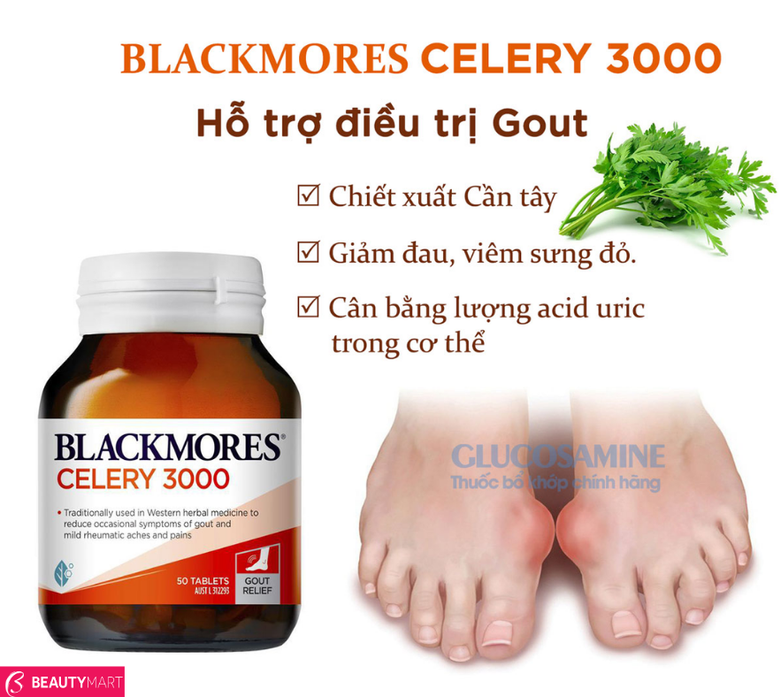 - Blackmores Celery 3000mg là sản phẩm chiết xuất từ hạt cần tây đã được nghiên cứu và chứng minh về khả năng hỗ trợ đào thải acid uric, giảm lượng acid uric trong thận, từ đó, giảm sự lắng đọng của chúng ở khớp, giảm nguy cơ bị gout. Sử dụng Celery 3000mg của Úc còn giúp lợi tiểu, đào thải độc tố giảm mỡ máu,...