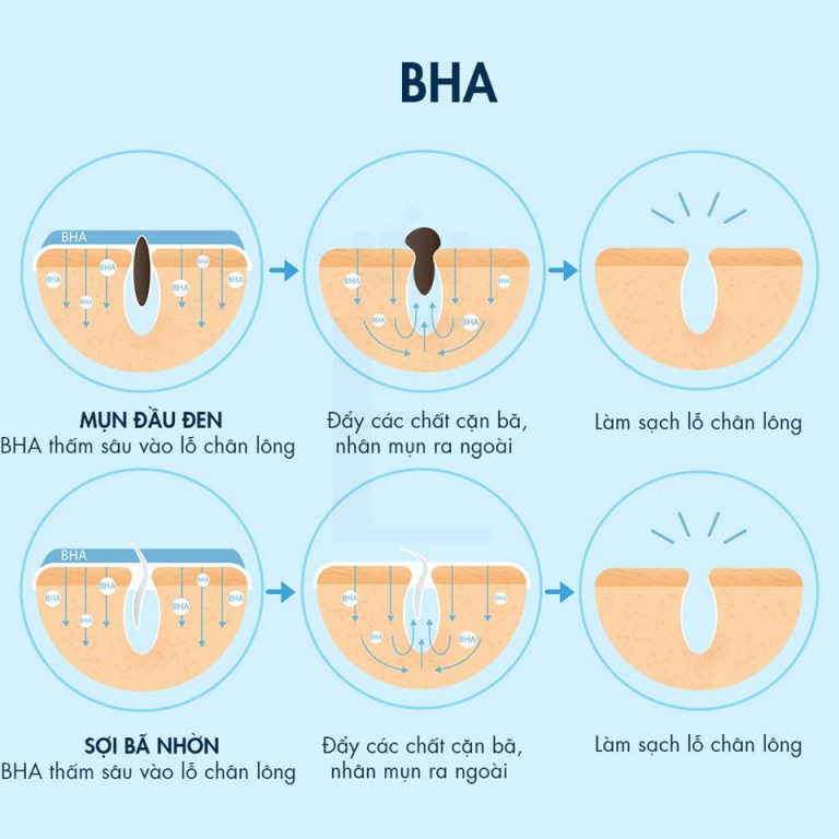 BHA tiêu diệt mụn bằng cách thấm sâu vào lỗ chân lông, đẩy tế bào chết, các chất cặn bã và nhân mụn ra ngoài. Khả năng thấm sâu và làm sạch bên trong lỗ chân lông của BHA khiến nó trở nên đặc biệt hiệu quả trong việc điều trị mụn.