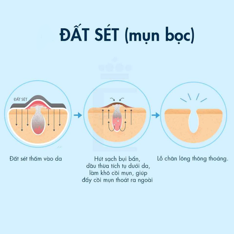 Đất sét sẽ giúp hút sạch dầu thừa trên da, lấy đi các chất bẩn và tế bào chết tích tụ dưới da và làm khô cồi mụn, đẩy cồi mụn một cách nhanh chóng. Không những vậy, thành phần dưỡng da có trong đất sét còn thấm sâu và nuôi dưỡng làn da của bạn hiệu quả.