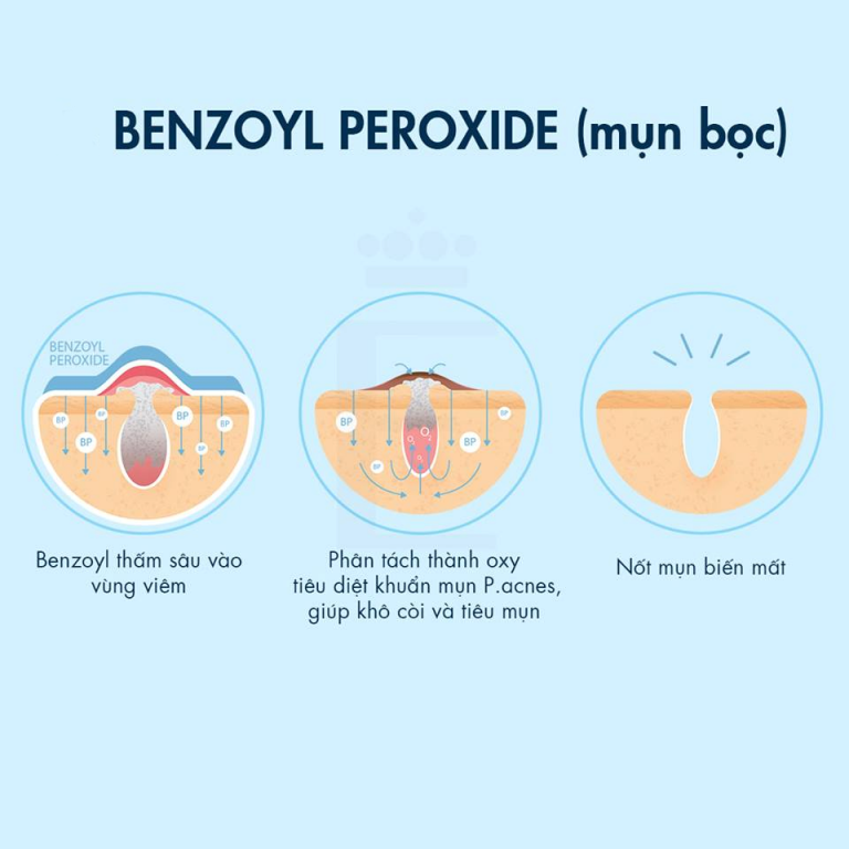 Benzoyl Peroxide (BP) được sử dụng trong rất nhiều sản phẩm trị mụn. Nó hoạt động bằng cách phá vỡ thành acid benzoic và oxy khi chạm vào da. Oxy giúp tiêu diệt vi khuẩn P.acnes, và acid benzoic đóng vai trò như một chất tẩy tế bào chết sâu, loạt bỏ da chết và bã nhờn bên trong lỗ chân lông.