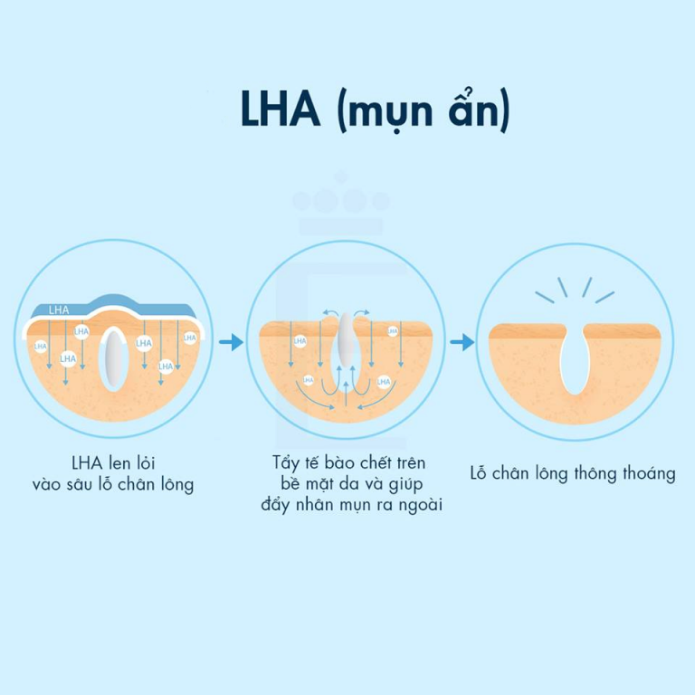 LHA được xem là một thành phần đột phá trong điều trị mụn, có khả năng ngăn ngừa mụn qua 2 cơ chế: đào thải tế bào chết, làm lỏng bã nhờn và đẩy nhân mụn thoát ra ngoài.