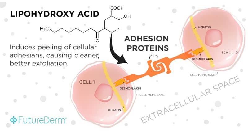 Khi tiếp xúc với da, LHA len lỏi vào các tuyến bã nhờn, đẩy dầu thừa và bụi bẩn tích tụ lên trên bề mặt da. Mặt khác nó làm lỏng liên kết protein giữa các tế bào sừng ở lớp ngoài cùng để nhân mụn dễ dàng thoát ra ngoài và bong ra.