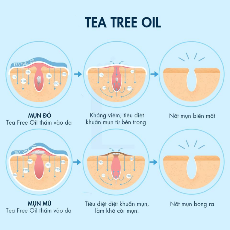 Tea tree oil hay còn gọi là “tinh dầu tràm trà” khi thấm sâu vào da có khả năng kháng viêm, tiêu diệt khuẩn mụn, giảm sưng viêm, nhanh chóng làm khô cồi mụn.
