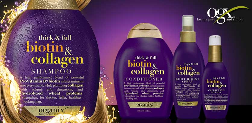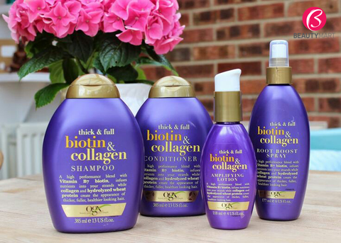 - Dầu gội & dầu xả Organix Thick & Full Biotin & Collagen có hợp chất ProVitamin B7 và biotin, tạo ra các chất dinh dưỡng thấm sâu, phục hồi từ bên trong sợi tóc.