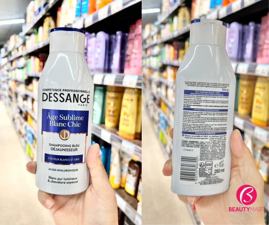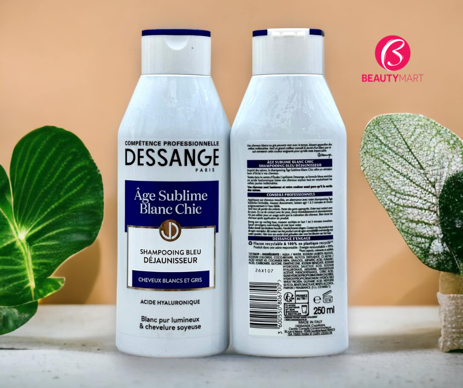 - Dầu gội DESSANGE Age Sublime Blanc Chic để trung hòa phản xạ màu của tóc và làm hồi sinh sự bóng mượt, chắc khoẻ của mái tóc bị bạc sớm hoặc chớm bạc