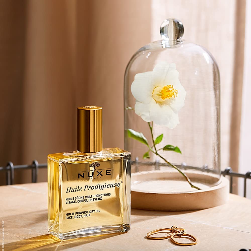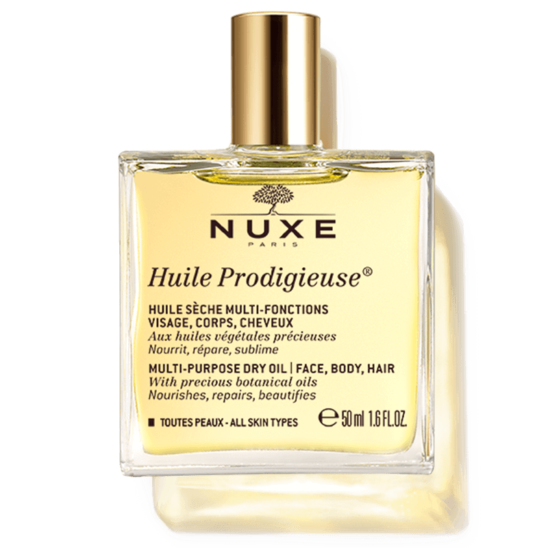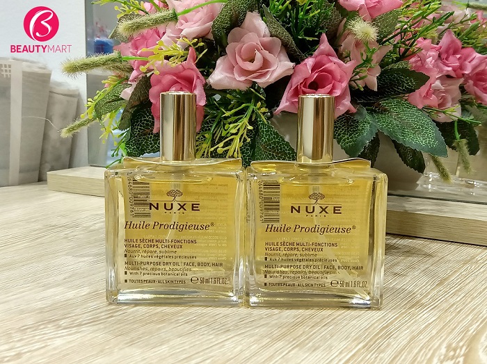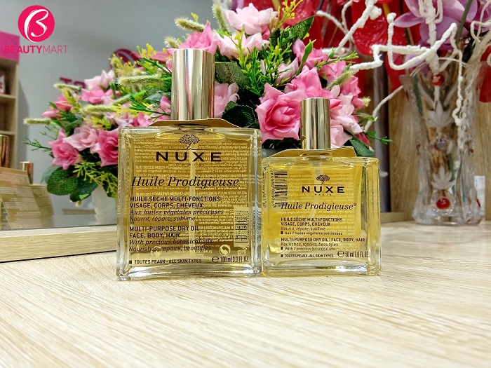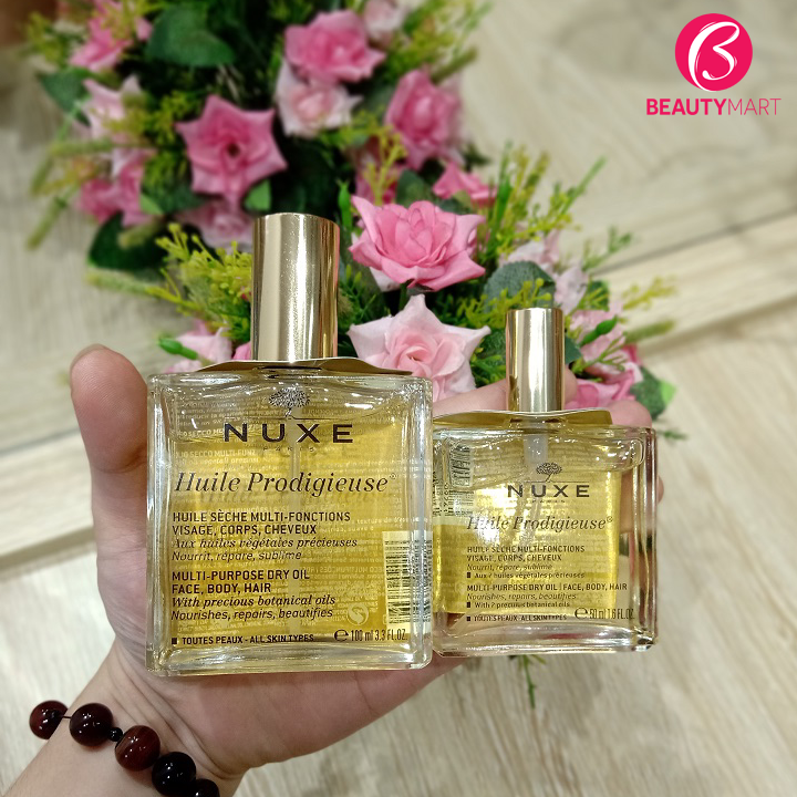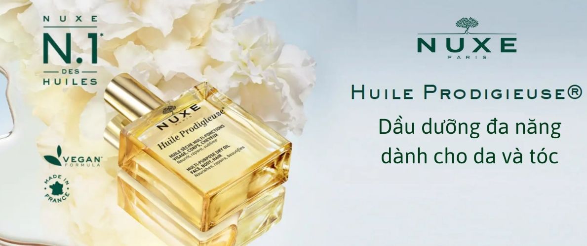 Nuxe Huile Prodigieuse là dầu khô đa năng được tinh chế từ hơn 98% thành phần có nguồn gốc từ thiên nhiên, trong đó chứa 6 loại dầu thực vật quý hiếm giàu dưỡng chất cùng vitamin E, có tác dụng trong dưỡng da và tóc.