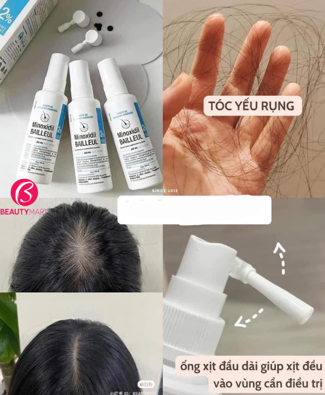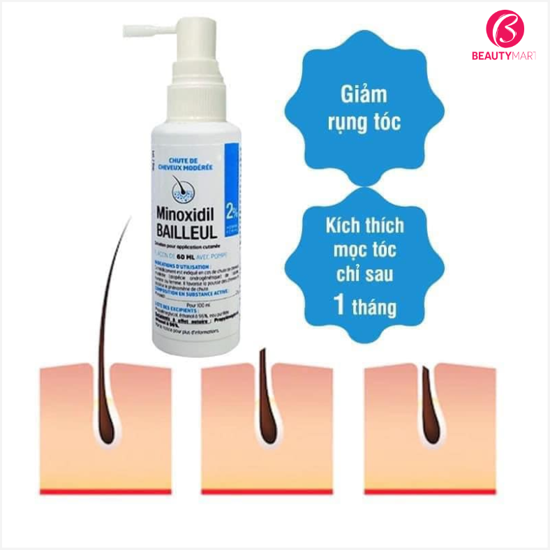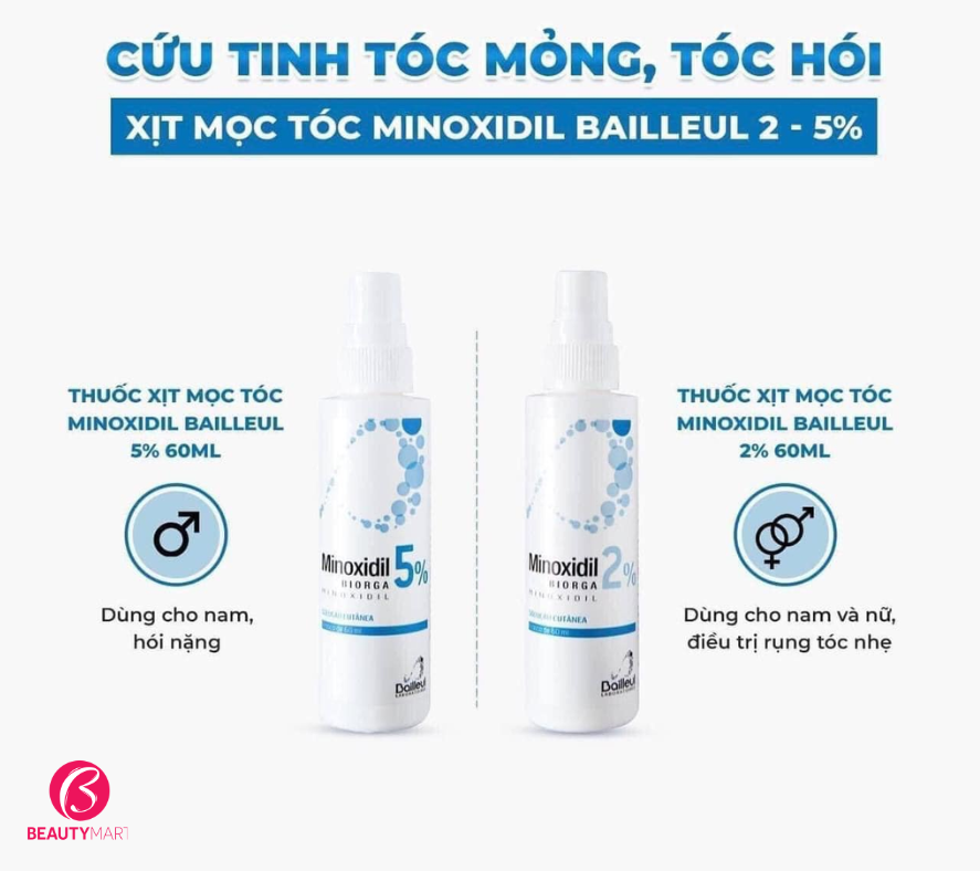 - Xịt mọc tóc Minoxidil Bailleul 5%: Chỉ nên dùng cho nam giới. Xem chi tiết sản phẩm tại đây: MINOXIDIL BAILLEUL 5% 3 Lọ X 60ml - Set 3 Lọ Xịt Mọc Tóc