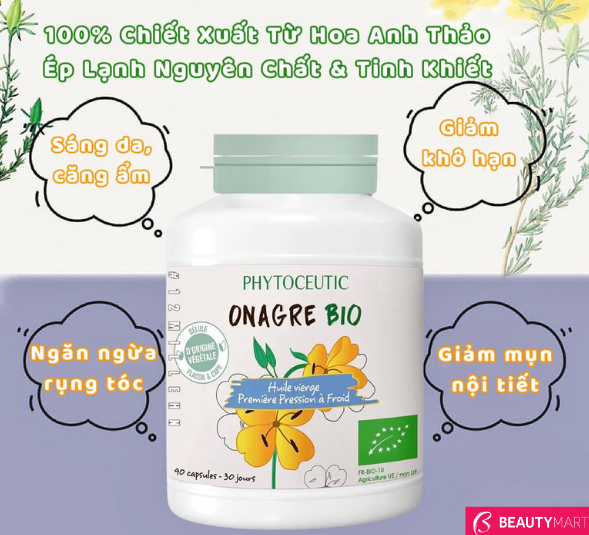 - Hoa anh thảo hữu cơ Phytoceutic Onagre Bio 90 viên là anh thảo số 1 tại Pháp. Sản phẩm có nguồn gốc hữu cơ chất lượng cao, công nghệ ép lạnh hiện đại chỉ lấy nước ép đầu tiên tinh khiết nhất, hàm lượng cao nhất tạo nên viên uống hoa anh thảo mang hiệu quả tuyệt vời chỉ sau 1-2 tháng sử dụn. Ngoài ra, thành phần còn bổ sung dầu hoa lưu ly hỗ trợ giữ ẩm, làm đẹp da.