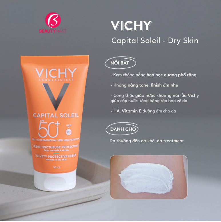 Nhắc đến những dòng kem chống nắng nổi tiếng của Vichy thì chắc chắn các bạn đã nghe qua Kem chống nắng Vichy Capital Ideal Soleil Dry Touch, xịt chống nắng Body Vichy, Kem chống nắng Vichy Capital Ideal Soleil Anti Sand Milk nhưng một dòng kem chống nắng khác nổi tiếng không kém cạnh của hãng là Kem chống nắng Vichy Capital Ideal Soleil Velvety. Vậy em này có gì đặc biệt?. Hãy cùng BeautyMart tìm hiểu nhé.