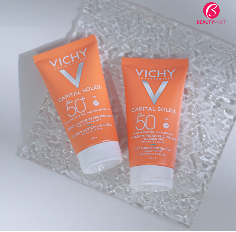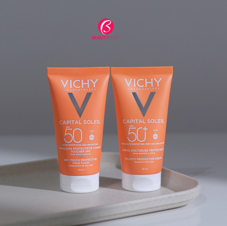 Kem Chống Nắng Vichy Capital Ideal Soleil Velvety Cream SPF50+ Cho Da Thường, Da Khô và Kem chống nắng Vichy Capital Soleil Dry Touch Face Fluid cho da dầu 50ml