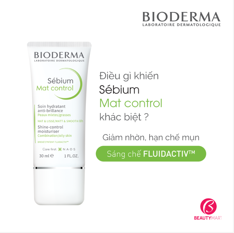 Kem dưỡng ẩm Bioderma Sebium Mat Control nhận được bằng sáng chế Fluidactic sinh học normalises về kiểm soát chất bã nhờn và ngăn ngừa tắc nghẽn các lỗ chân lông.