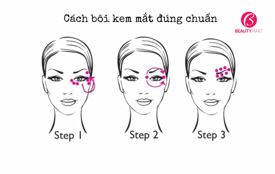 - Sau khi làm sạch da và các bước dưỡng, bạn dùng đầu ngón tay trỏ lấy một lượng kem vừa đủ, massage nhẹ nhàng vùng da quanh mắt theo hướng từ trong ra ngoài và từ dưới lên trên trong khoảng 2-3 phút.