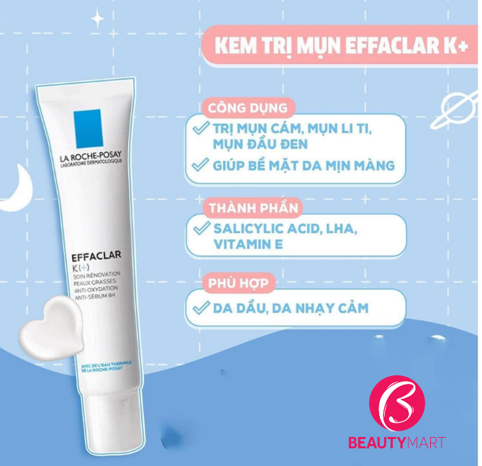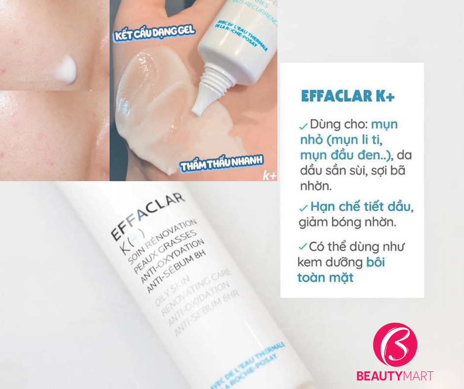 Thì song song với đó là dòng kem trị mụn tốt Effaclar K(+) với phiên bản mới (2016) được đánh giá là giải pháp cho những làn da dầu, sần sùi, ngăn ngừa việc tái phát mụn (mụn cám, mụn li ti, mụn ẩn và mụn đầu đen...) đồng thời đóng vai trò như một loại kem dưỡng giảm mụn giúp cải thiện bề mặt da & chống lại sự oxy hóa.