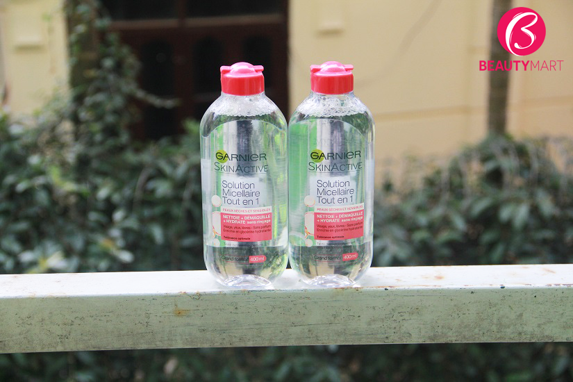 Nước tẩy trang Garnier SkinActive dành cho da khô nhạy cảm có thiết kế nắp đỏ, chai nhựa trong suốt, dung tích lớn 400ml. Sản phẩm là dạng dung dịch không mùi (no perfume – không chứa nước hoa), dùng tẩy trang vùng da mặt, cổ, môi và cả mắt.