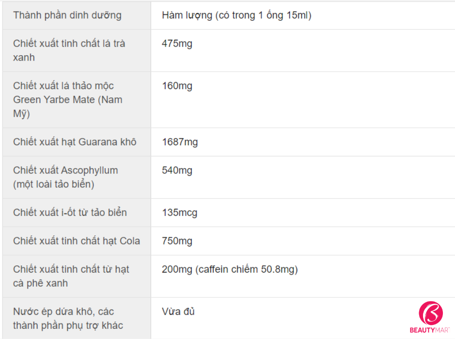 - Thành phần: Chiết xuất Cola, trà xanh, cà phê xanh, thảo dược quý