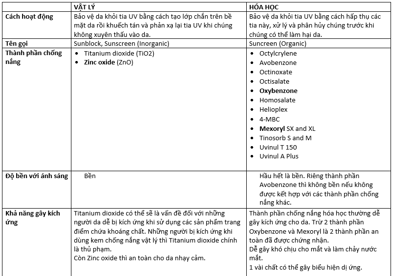 Để tiện so sánh các điểm đặc trưng của 2 loại kem chống nắng vật lý và hóa học, mình đã kỳ công vẽ ra cái bảng sau:
