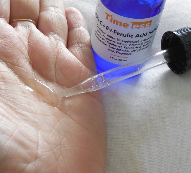 Timeless 20% Vitamin C + E Ferulic Acid Serum trong suốt, có một mùi hương khá nhẹ, đặc hơn nước một chút. Với dung tích 30ml, hãng khuyên nên dùng trong vòng 3 tháng để đảm bảo chất lượng sản phẩm. Tuy nhiên, thời hạn sử dụng có thể được kéo dài hơn nếu bạn bảo quản serum trong tủ lạnh.