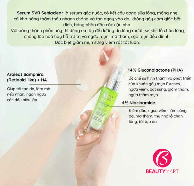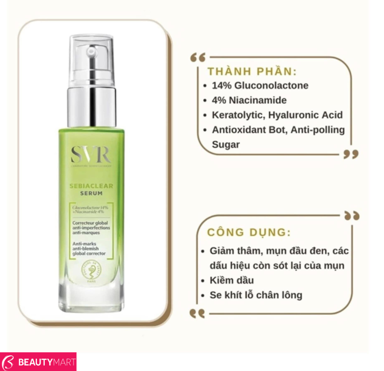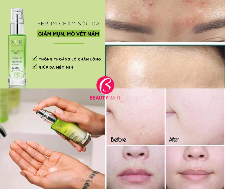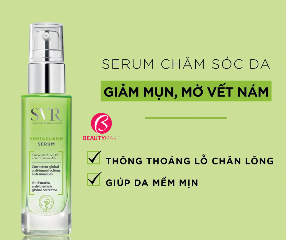Serum SVR Sebiaclear Làm Giảm Mụn, Mờ Nám, Làm Mềm Mịn Da 30ml chính hãng đã có mặt ở thị trường Việt Nam. Hàng chính hãng, giá tốt được phân phối tại thương hiệu chuyên Dược Mỹ phẩm Pháp BeautyMart. Dịch vụ ship COD toàn quốc, khách hàng kiểm hàng trước khi nhận, yên tâm khi mua.