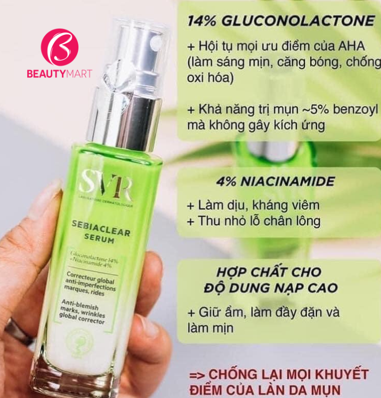 SVR Sebiaclear là serum được tạo ra để giải quyết các vấn đề về mụn, ngăn ngừa vi khuẩn hình thành mụn. Ngoài ra sản phẩm còn giúp tẩy tế bào chết dịu nhẹ, giảm thâm mụn. Hơn nữa sản phẩm còn được bổ sung các dưỡng chất giúp cấp ẩm, giúp làn da chị em chúng mình trở nên mềm mịn nha.