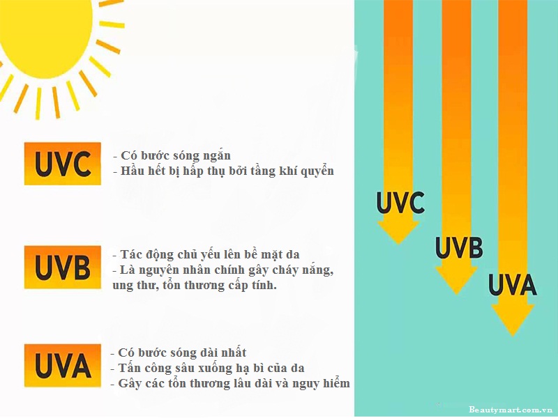 Nếu hiểu một cách đơn giản thì ánh nắng mặt trời có thành phần chính là tia UV (hay còn gọi với tên khác là tia tử ngoại, tia cực tím, bức xạ UV). Tia UV cơ bản có 3 dạng: