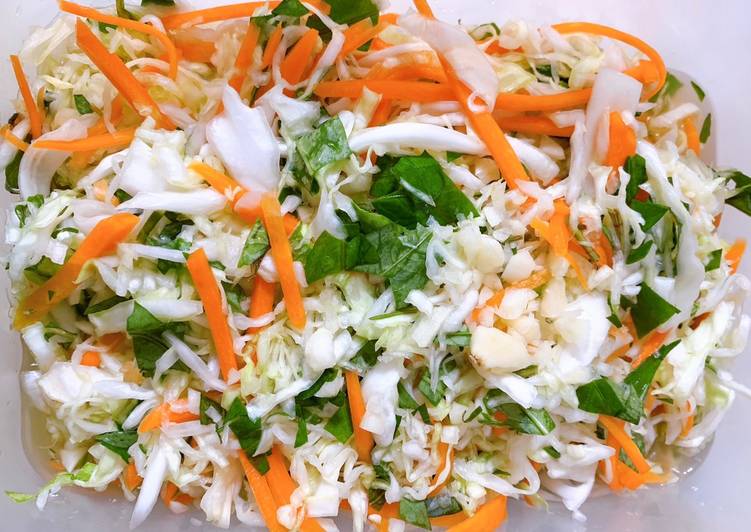 Bắp cải trắng rất phổ biến và dễ tìm mua ở siêu thị hoặc cửa hàng thực phẩm. Sau khi sơ chế và thái nhỏ, bạn ngâm bắp cải với hỗn hợp nước đường, muối và có thể thêm một ít giấm tùy khẩu vị. Để cho món dưa cải chua được thơm ngon và hấp dẫn hơn, bạn cũng có thể cho thêm cà rốt, củ cải thái nhỏ và một ít rau răm hoặc hành lá. Chỉ bằng cách chế biến đơn giản như vậy bạn đã có ngay một món dưa cải chua tốt cho sức khỏe đường ruột của mình.