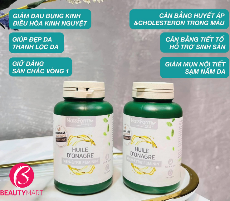 - Tinh dầu hoa anh thảo Nat & Form Huile D’Onagre có hàm lượng tinh khiết cao, kết hợp tinh dầu anh thảo, tinh dầu hoa lưu ly và tinh dầu vitamin E. Viên nang nhỏ dễ uống, hấp thu nhanh, không gây tác dụng phụ.