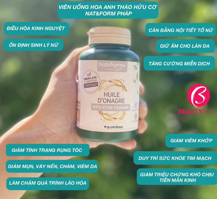 - Viên tinh dầu hoa anh thảo Nat & Form Huile D’Onagre là sản phẩm cao cấp từ nguyên liệu hữu cơ. Hoa anh thảo giàu acid béo Omega 6 và hoạt chất chống viêm tự nhiên, chất chống oxy hóa mạnh mẽ,... hỗ trợ sức khỏe và sinh lý nữ.