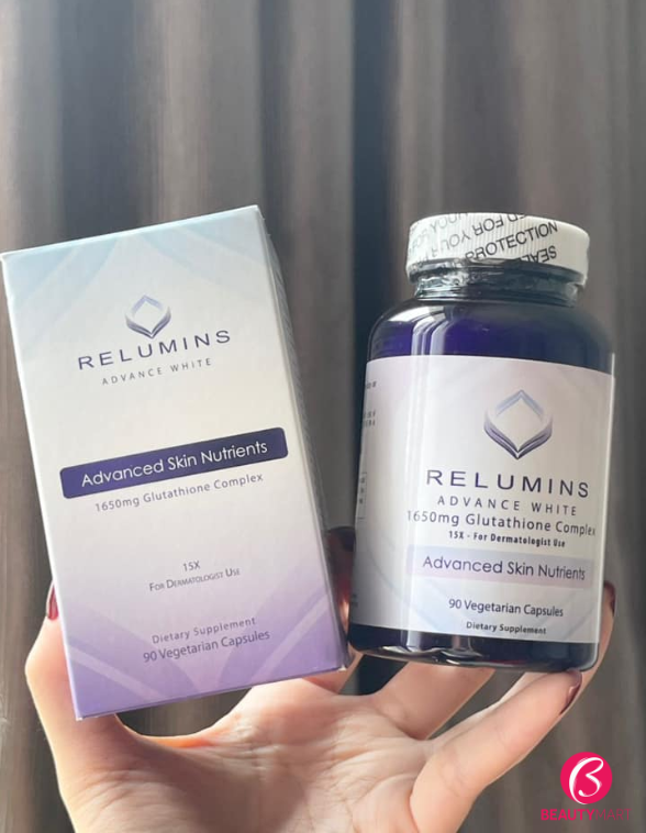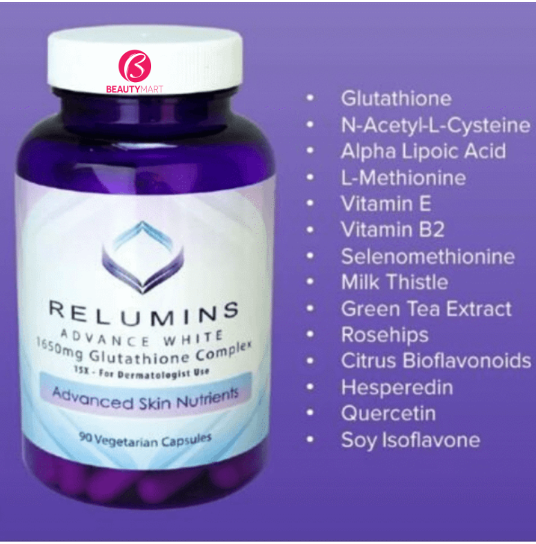 - Relumins L- Glutathione phức tạp là Glutathione miệng tiên tiến và công thức có sẵn nhau thai . Nó là làm trắng da hiệu quả và có nhiều lợi ích sức khỏe khác.