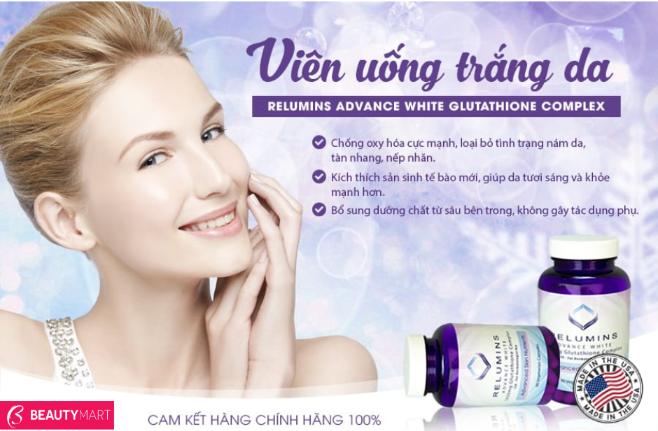 Viên Uống Trắng Da Relumins Advance White Glutathione Complex chính hãng đã có mặt ở thị trường Việt Nam. Hàng chính hãng, giá tốt được phân phối tại thương hiệu UY TÍN gần 20 năm kinh nghiệm và phân phối chính hãng chuyên Dược Mỹ phẩm Pháp BeautyMart. Dịch vụ ship COD toàn quốc, kiểm hàng trước khi nhận và bảo hành sau bán hàng nên khách hàng hoàn toàn yên tâm khi mua hàng chính hãng tại BeautyMart.