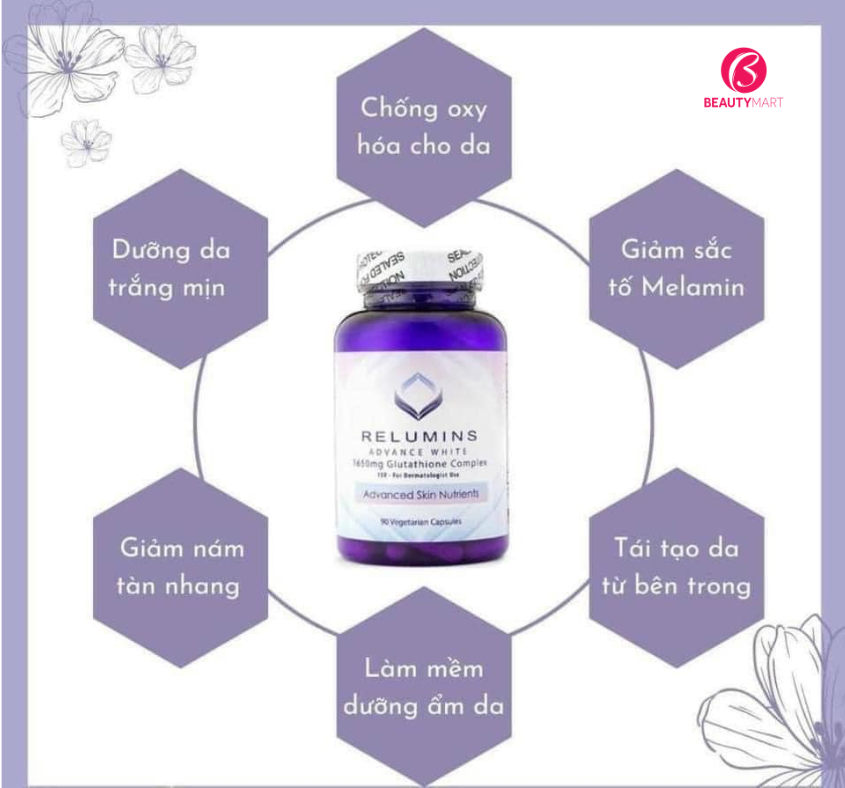 - Hàm lượng cao Glutathione là chìa khóa cho làn da trắng sáng tự nhiên, chống oxy hóa mạnh, chống lại gốc tự do, làm da trắng dần lên từ bên trong và đây là lý do Relumins là viên uống trắng da tiên tiến nhất hiện nay.