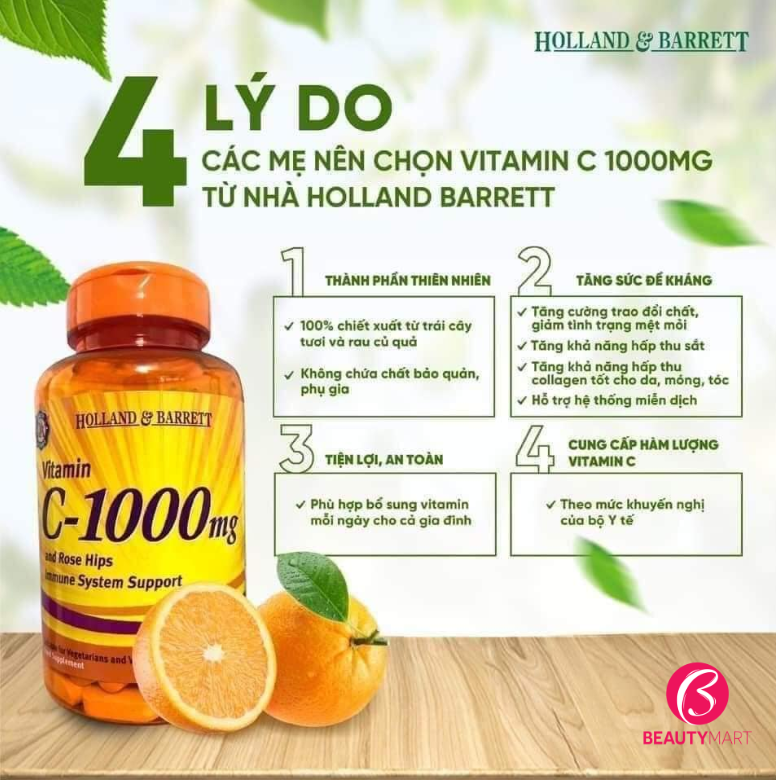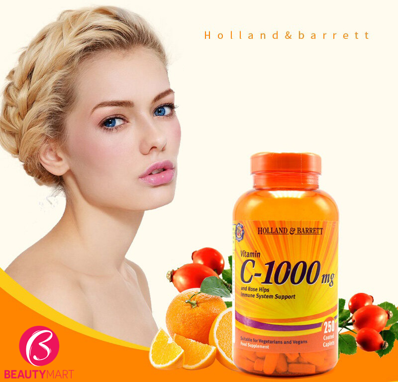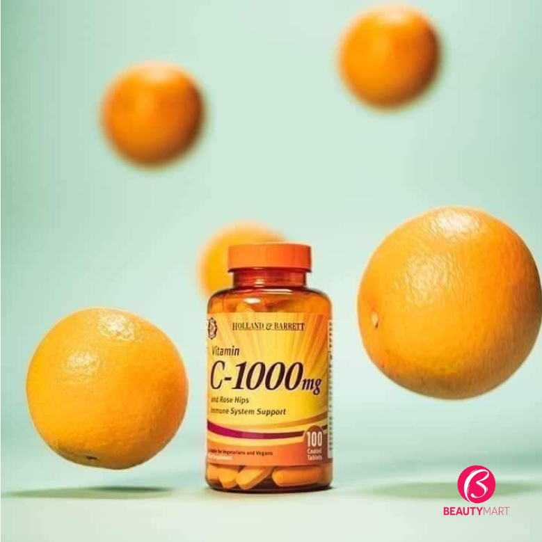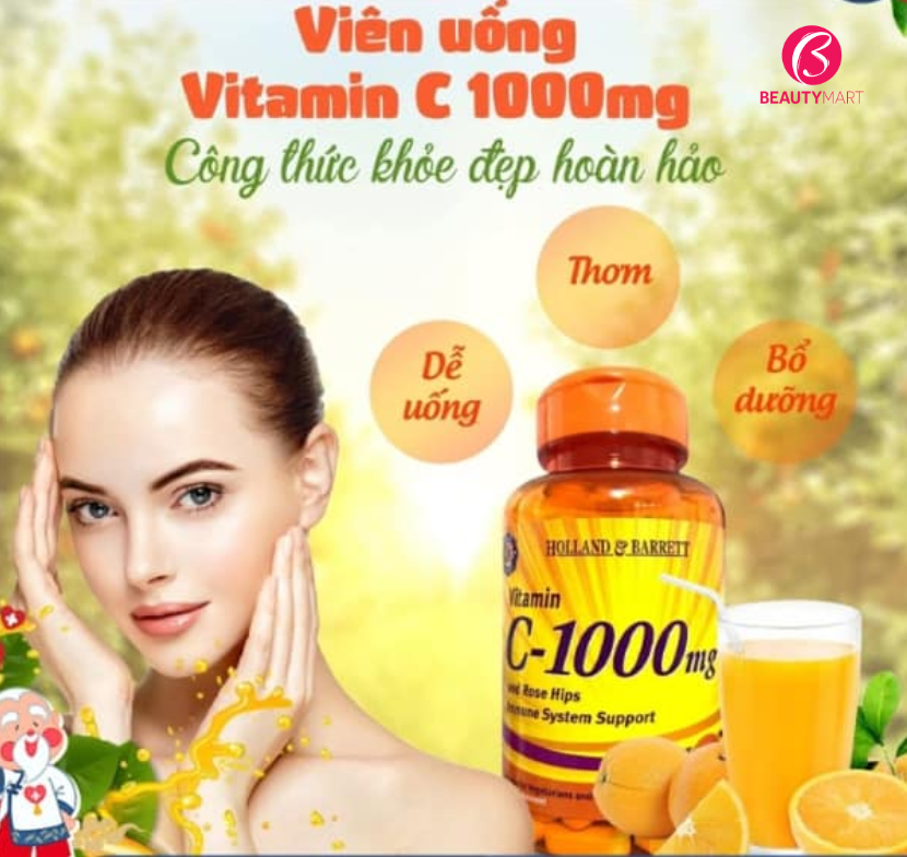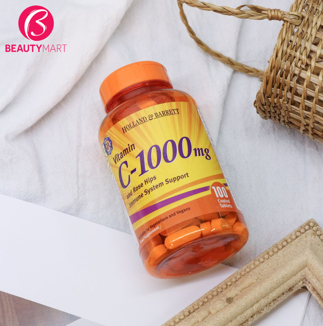 Vitamin C 1000mg Holland Barrett đến từ xứ sở Anh Quốc chính là một trong những lựa chọn phù hợp. Sản phẩm là sự kết hợp giữa vitamin C và Rose hip (quả tầm xuân), vừa có tính năng hỗ trợ tăng đề kháng - cải thiện miễn dịch, vừa cải thiện sắc tố da.