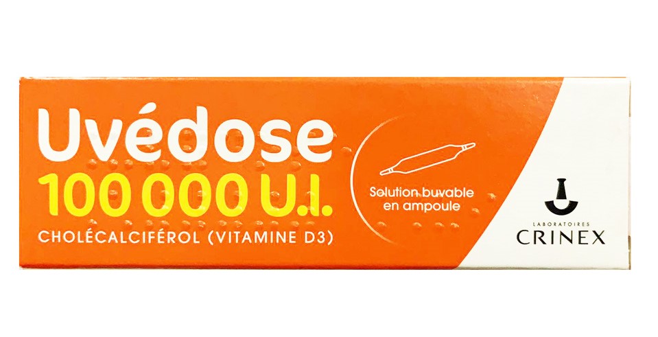 - Vitamin D3 Uvedose 100.000IU của Pháp dạng liều cao,sử dụng duy nhất 1 liều cho 3 tháng. Sản phẩm dạng ống 2ml cực kỳ dễ uống. Vitamin D3 này sẽ dự trữ ở các mô trong cơ thể, và giải phóng dần theo nhu cầu của cơ thể.
