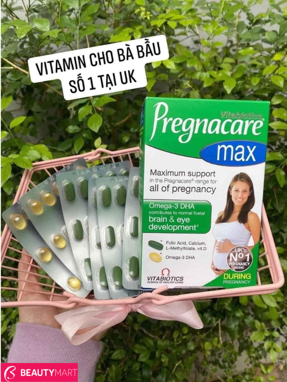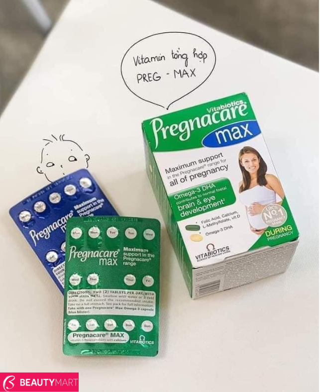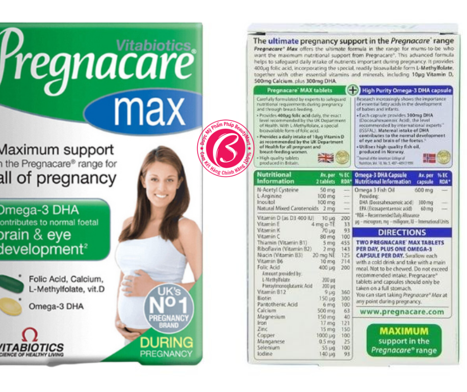Vitamin tổng hợp cho bà bầu Pregnacare Max bổ sung 300 mg DHA, 400ug axit folic, Omega-3, Canxi, Magiê, vitamin A, B, D, E, C, Kẽm … và nhiều chất dinh dưỡng cần thiết khác hỗ trợ cho sự phát triển não và mắt của thai nhi trong suốt thời gian thai kỳ.