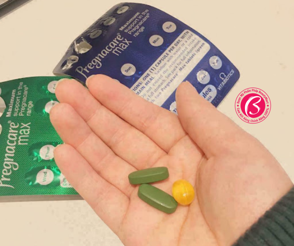 - Liều dùng: Mỗi ngày bạn uống 2 viên vitamin tổng hợp màu xanh và 1 viên omega màu vàng. Như vậy trung bình 1 tháng bạn sẽ dùng hết một hộp Pregnacare Max.
