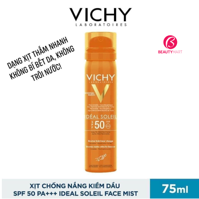 Xịt Chống Nắng Kiềm Dầu Vichy Ideal Soleil Face Mist SPF50 PA+++ 75ml đã có mặt ở thị trường Việt Nam. Hàng chính hãng, giá tốt được phân phối tại thương hiệu UY TÍN gần 20 năm kinh nghiệm và phân phối chính hãng chuyên Dược Mỹ phẩm Pháp BeautyMart. Dịch vụ ship COD toàn quốc, kiểm hàng trước khi nhận và bảo hành sau bán hàng nên khách hàng hoàn toàn yên tâm khi mua hàng chính hãng tại BeautyMart.
